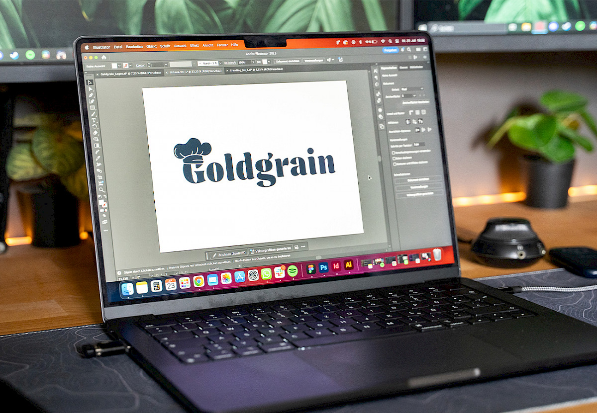 Für die imaginäre Bäckerei Goldgrain entwickelten wir ein vollständiges Branding-Kit, inklusive Logo, Submark, Muster, Mockups und Social Media Assets.
